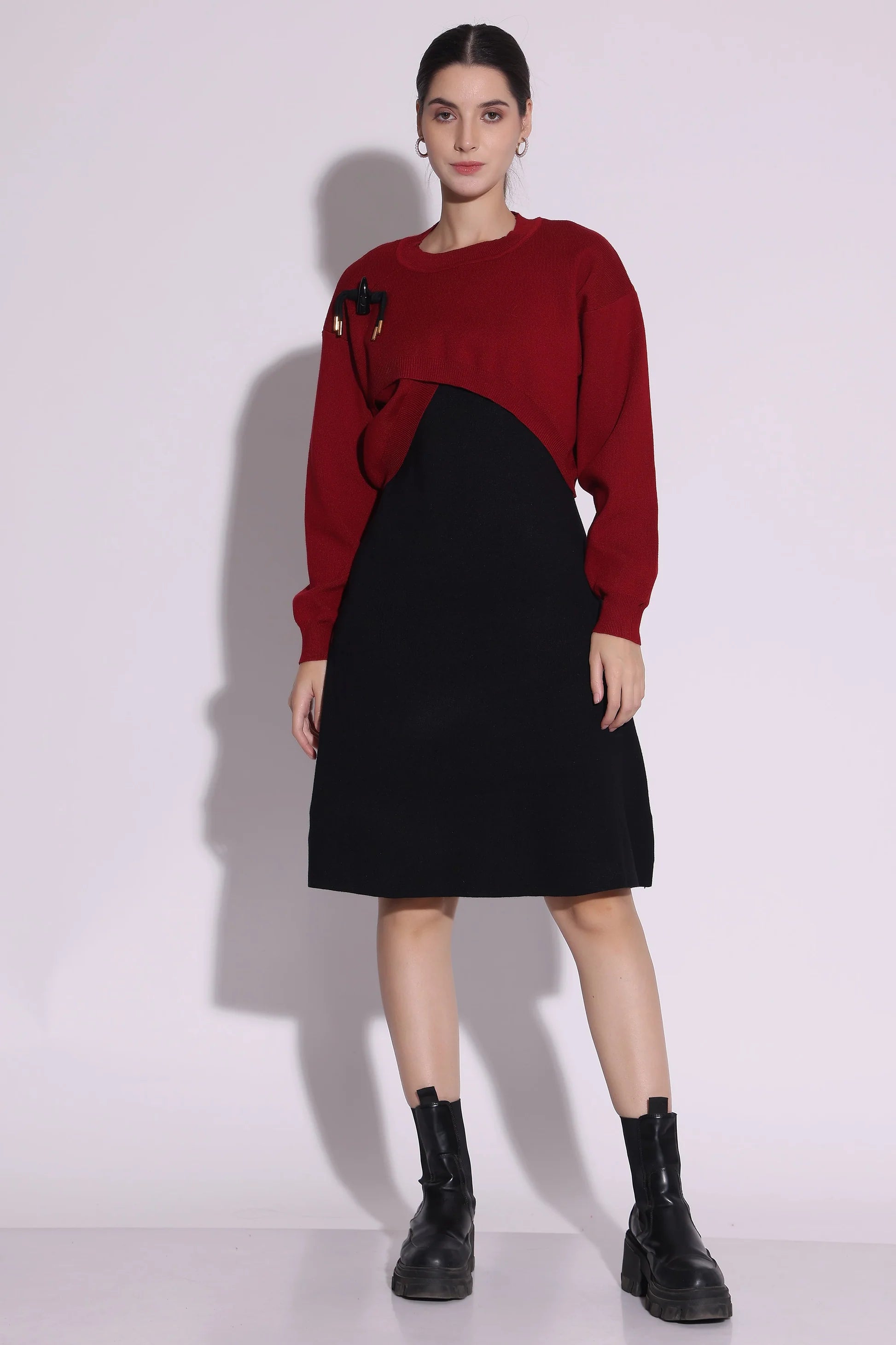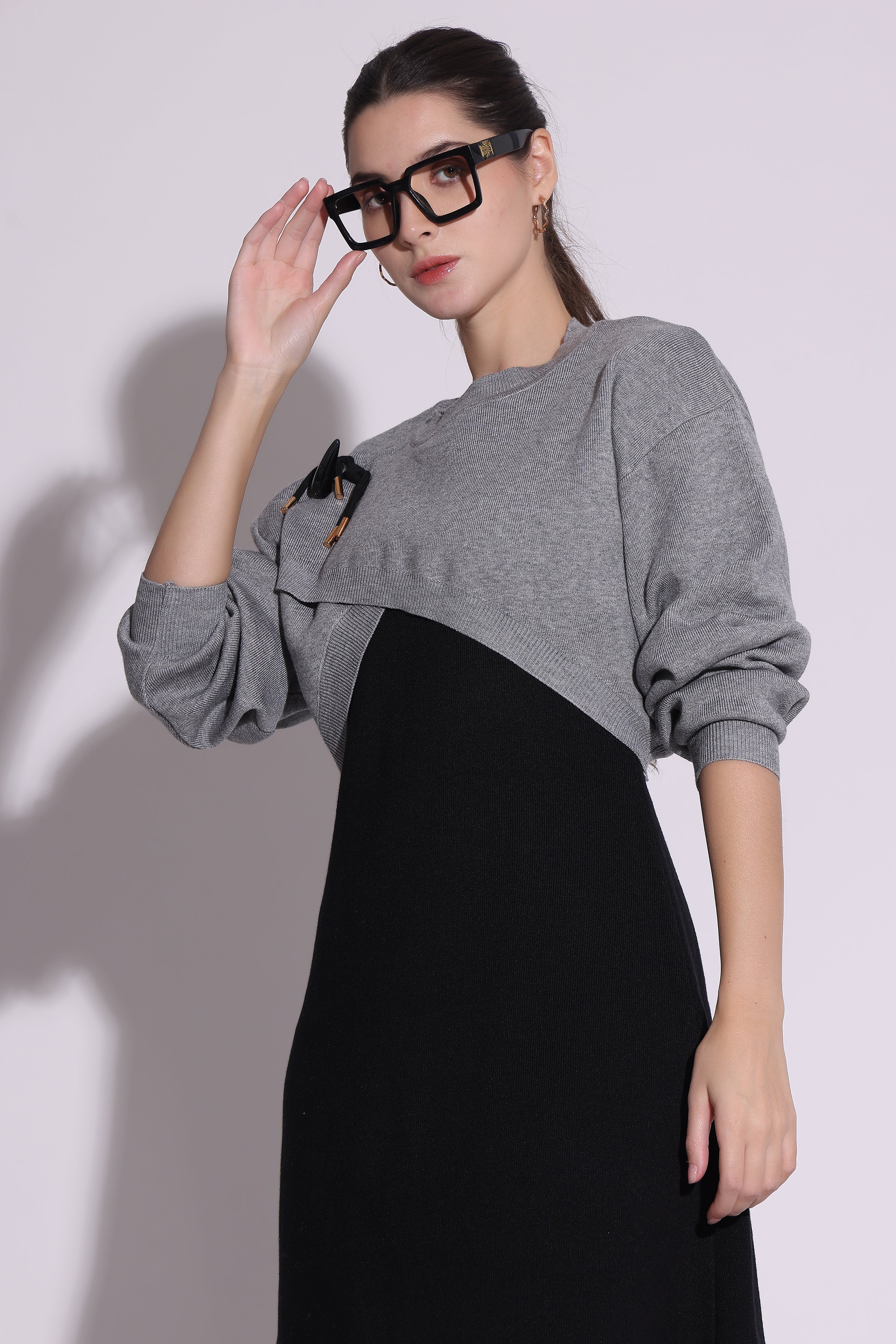 Elevate your winter wardrobe with the Dual-Tone Knit Midi Dress. This chic design features a cozy gray knit top layered over a sleek black flared skirt,...