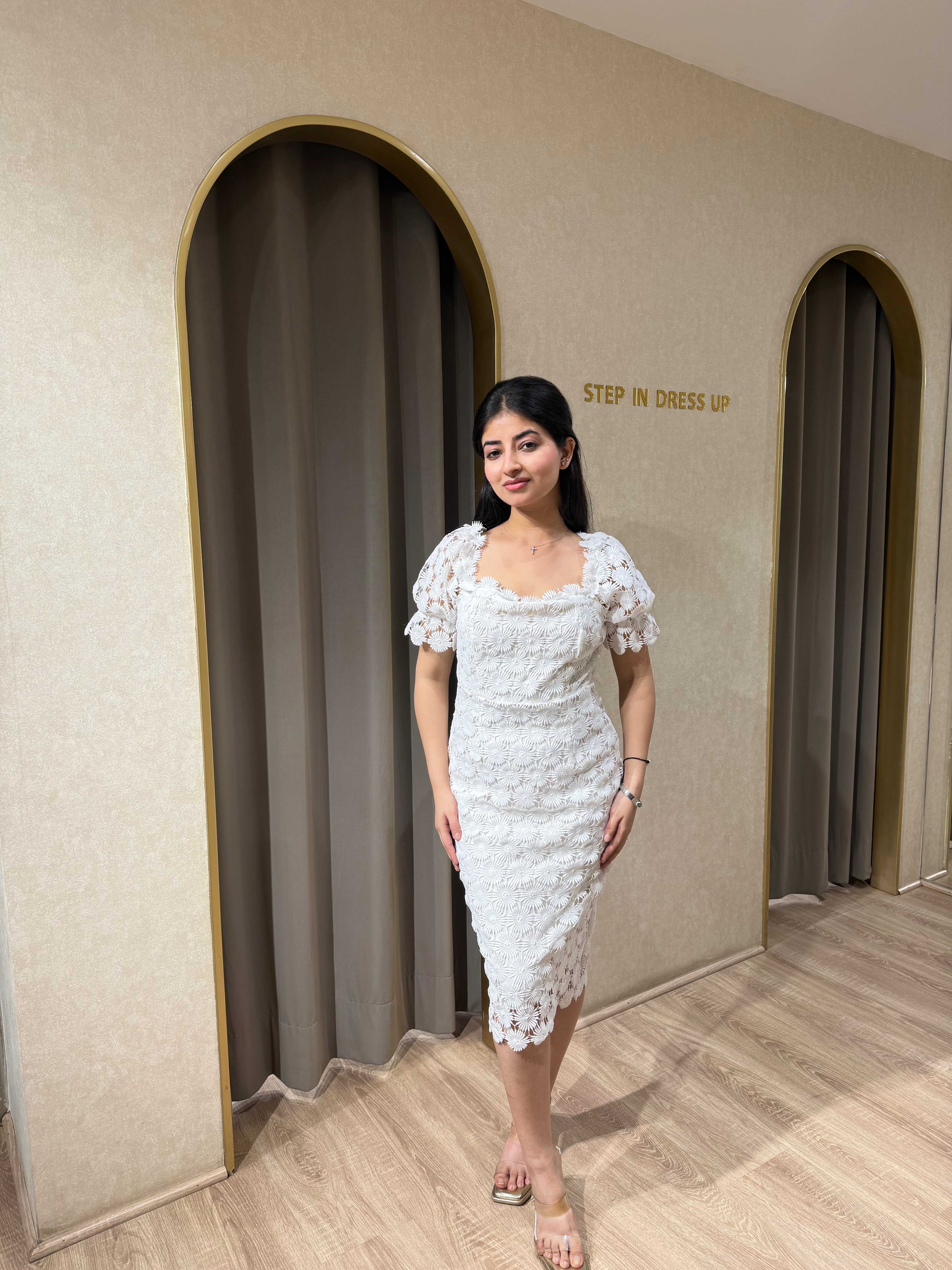 Make an entrance with the Floral Embellished Satin Dress, where contemporary elegance meets intricate detail. This stunning dress features a figure-flattering silhouette crafted from glossy satin...