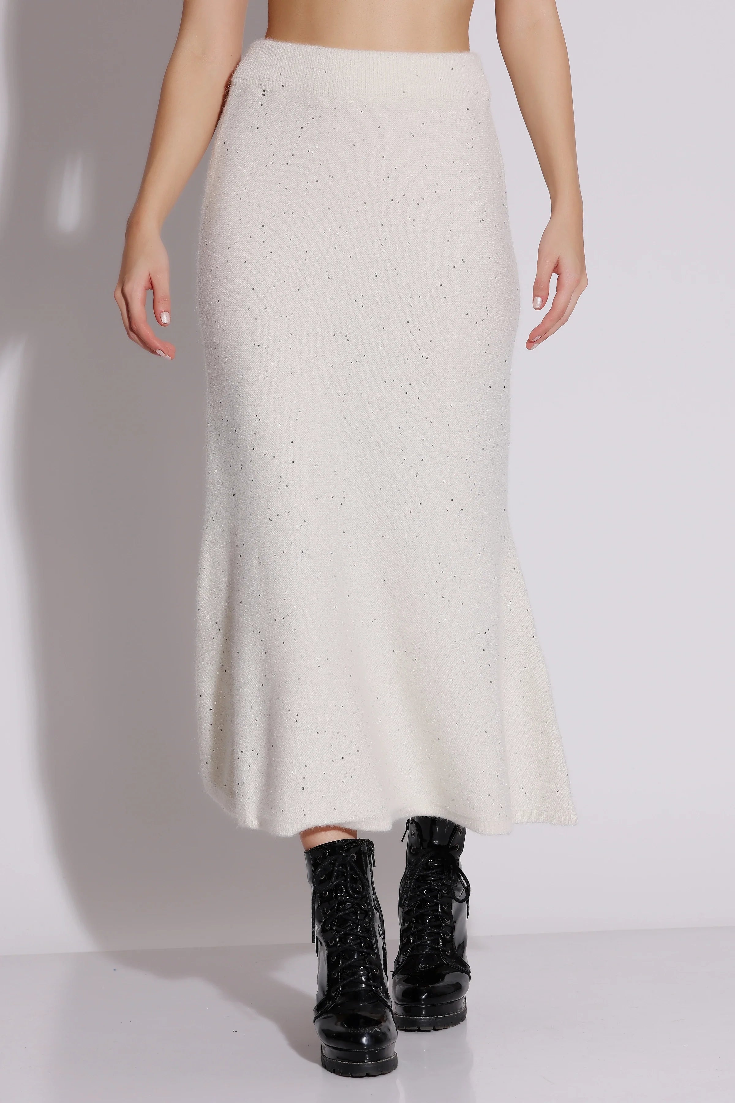 The skirt is covered in a dense pattern of small, shimmering sequins that catch the light and create a dazzling, eye-catching effect. The skirt has a...