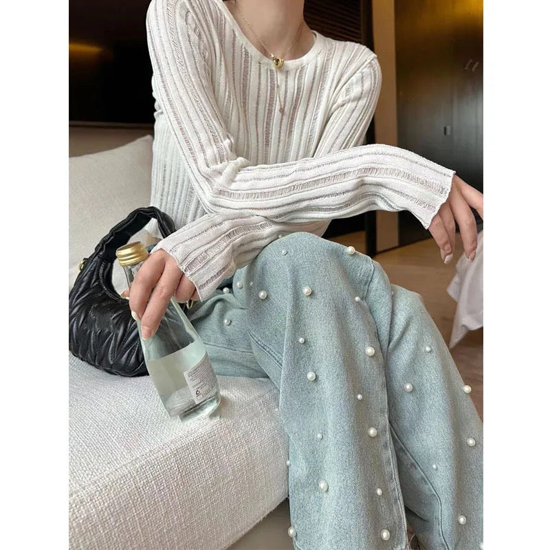 Rs. 2,299.00Rs. 2,299.00/Add a feminine twist to classic streetwear with these wide-leg, mid-wash denims embellished with delicate pearl beading. The relaxed fit and high-rise waist make them comfortable...