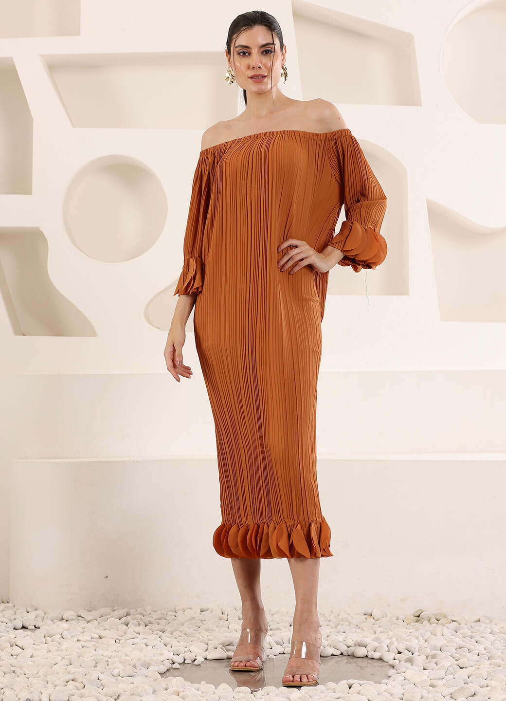 Rs. 2,209.00Rs. 2,209.00 Rs. 4,599.00/This off-shoulder mid-length dress exudes timeless elegance. Featuring a flattering silhouette and delicate detailing, it's perfect for both casual outings and special occasions. Color: Rust Brown...
