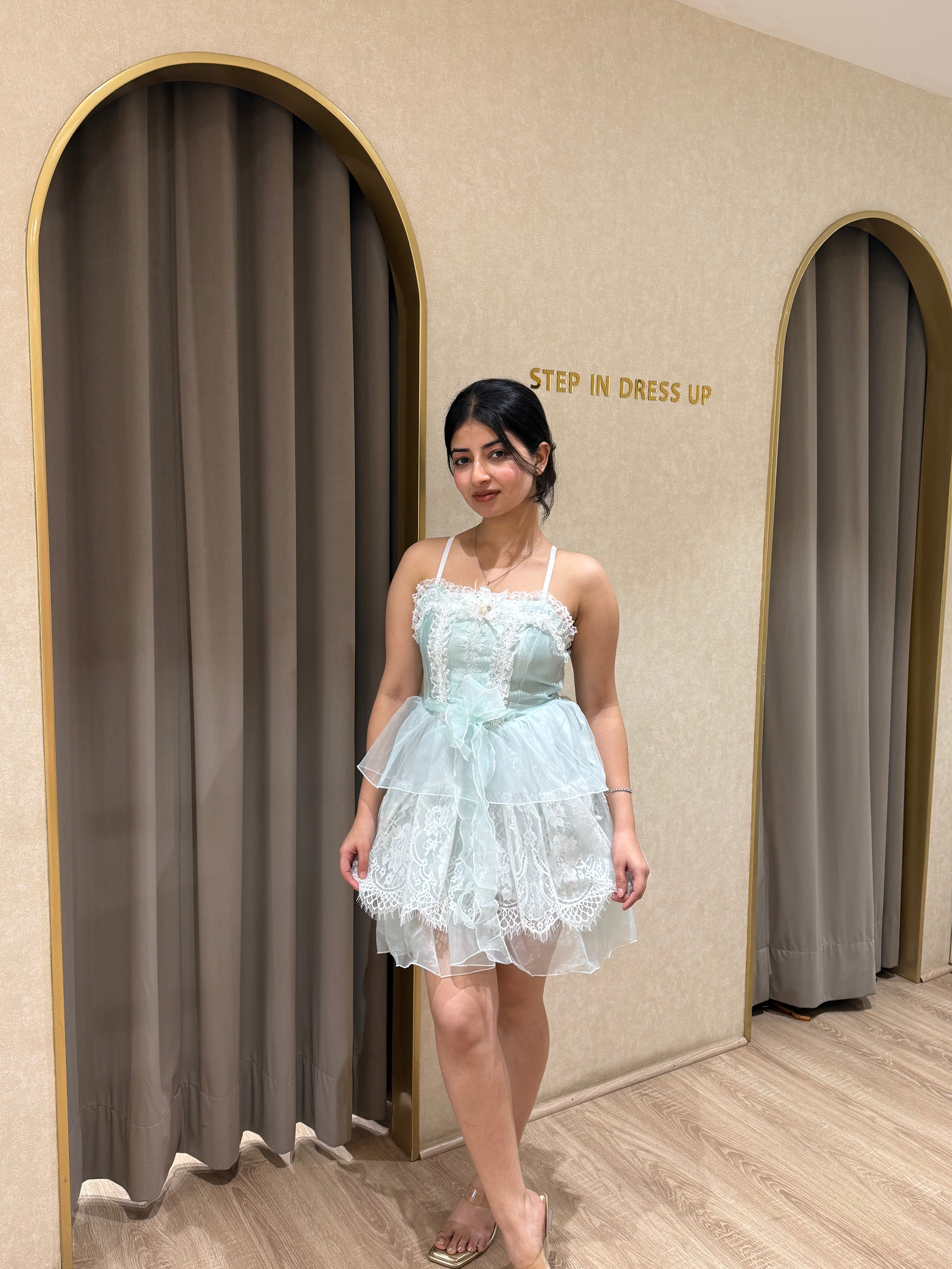 Rs. 2,299.00Rs. 2,299.00/Soft, feminine, and delicately detailed — the Icy Bloom Dress is a pastel mint dream woven with romance. Designed with a structured lace corset-style bodice and...
