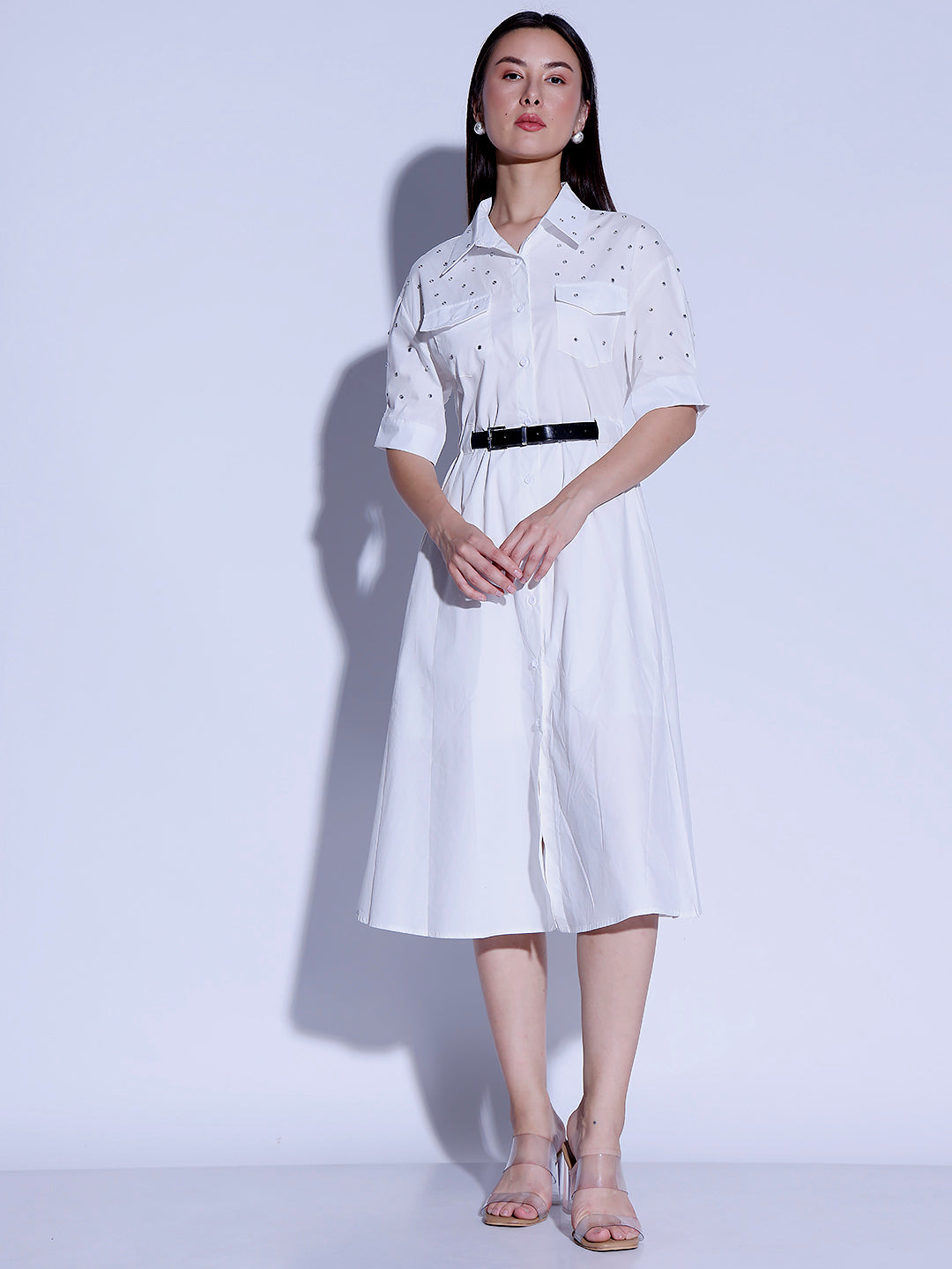 Rs. 5,759.00Rs. 5,759.00 Rs. 5,999.00/Elevate your style with our shirt dress featuring chic stud embellishments. Perfect for a touch of edgy elegance in any outfit. Colour: white