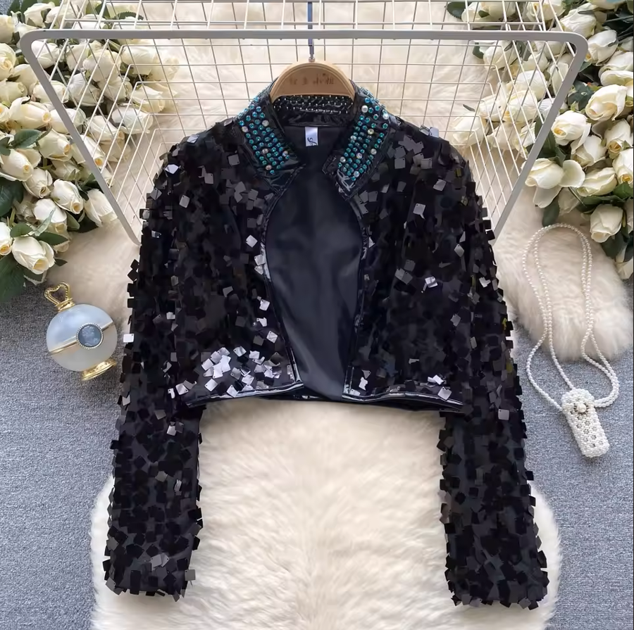 Prism mirror sequin statement jacket – rainbow noir & midnight spark