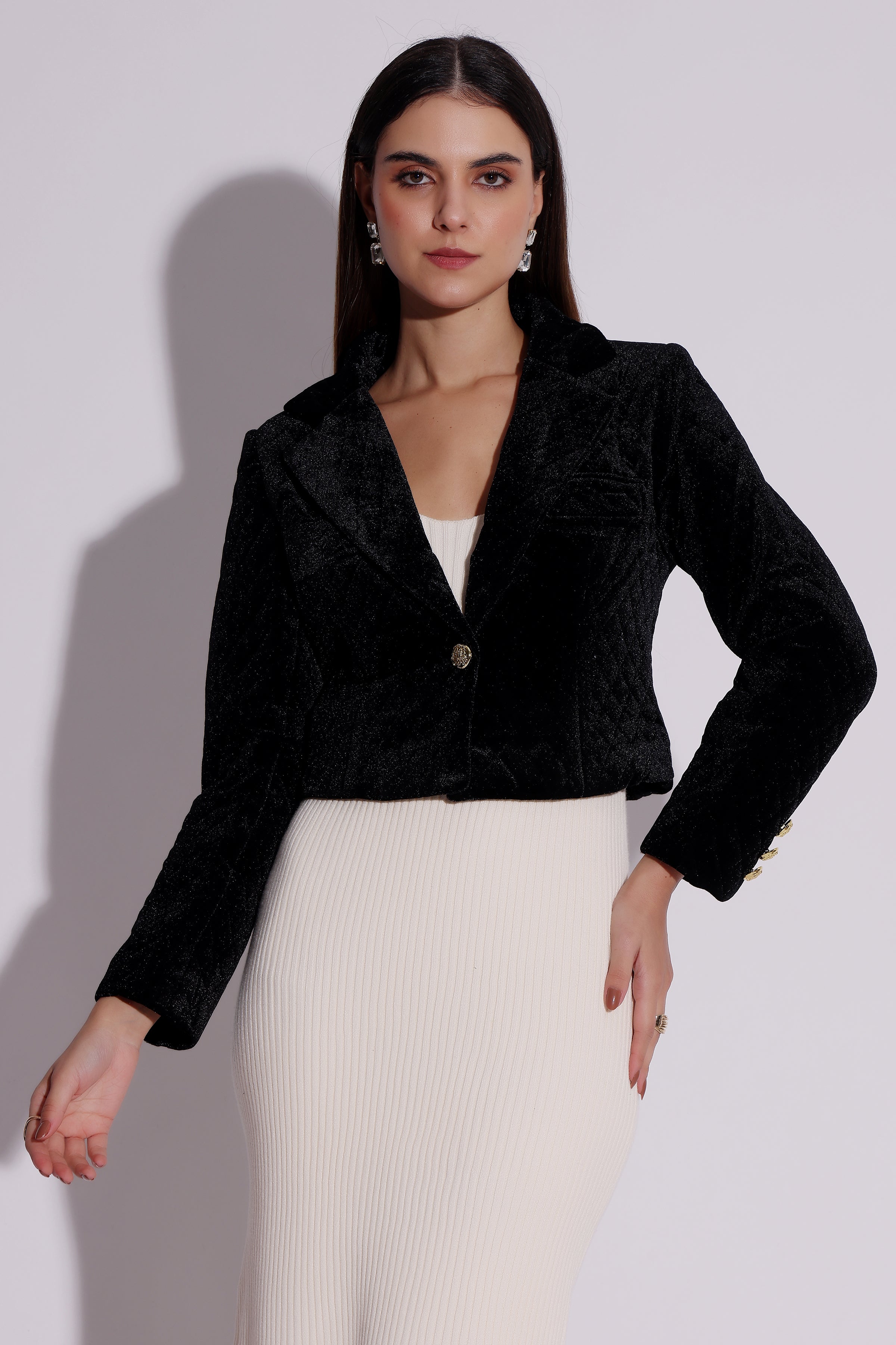 Rs. 3,999.00Rs. 3,999.00/Add a touch of sophistication to your wardrobe with this chic cropped velvet blazer. Designed with a lustrous black finish, it features a structured lapel collar,...