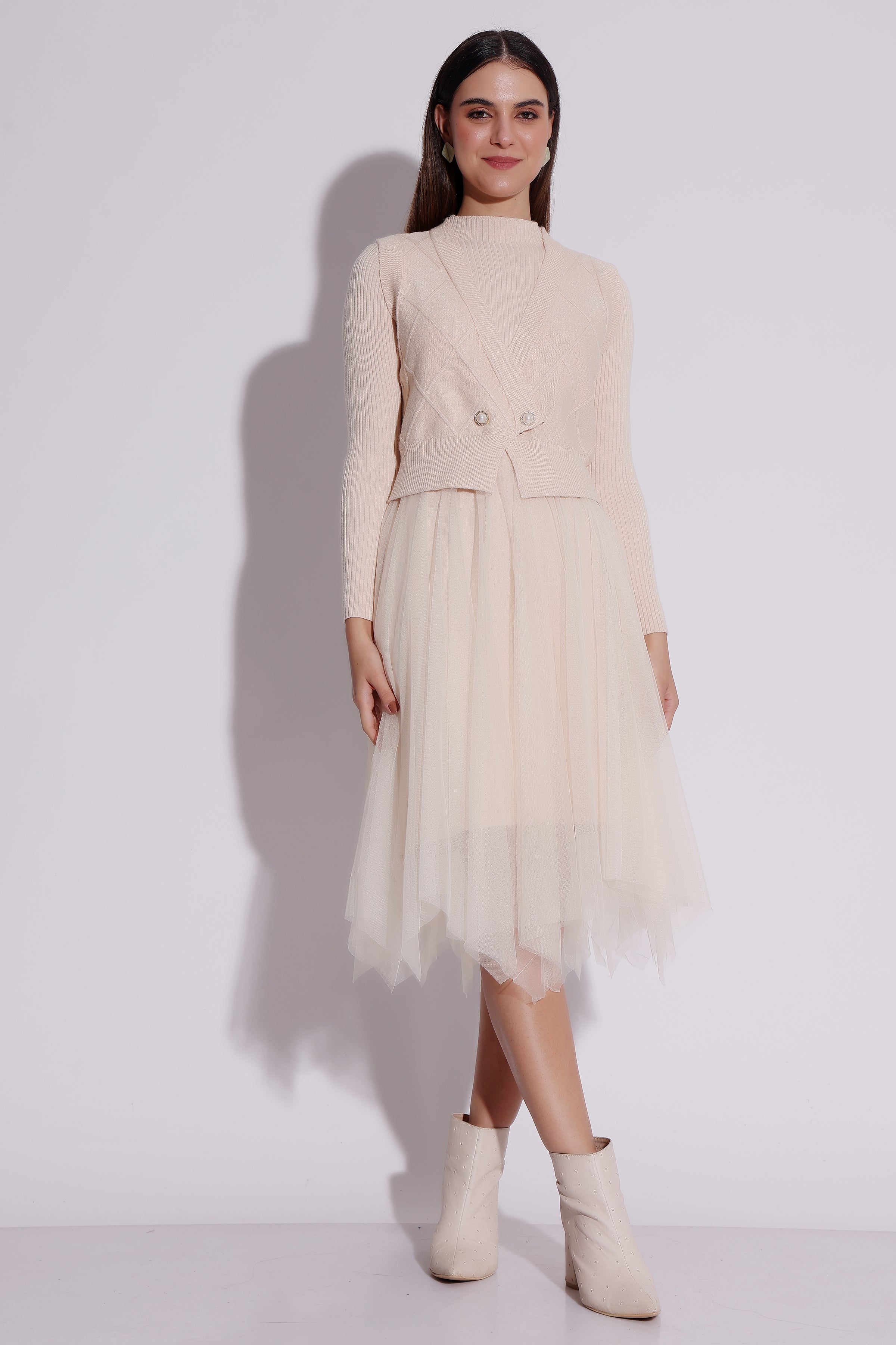 Rs. 2,899.00Rs. 2,899.00/This elegant ivory dress features a ribbed knit texture and a peplum waist design. The high neckline and long sleeves create a refined, sophisticated look. The...