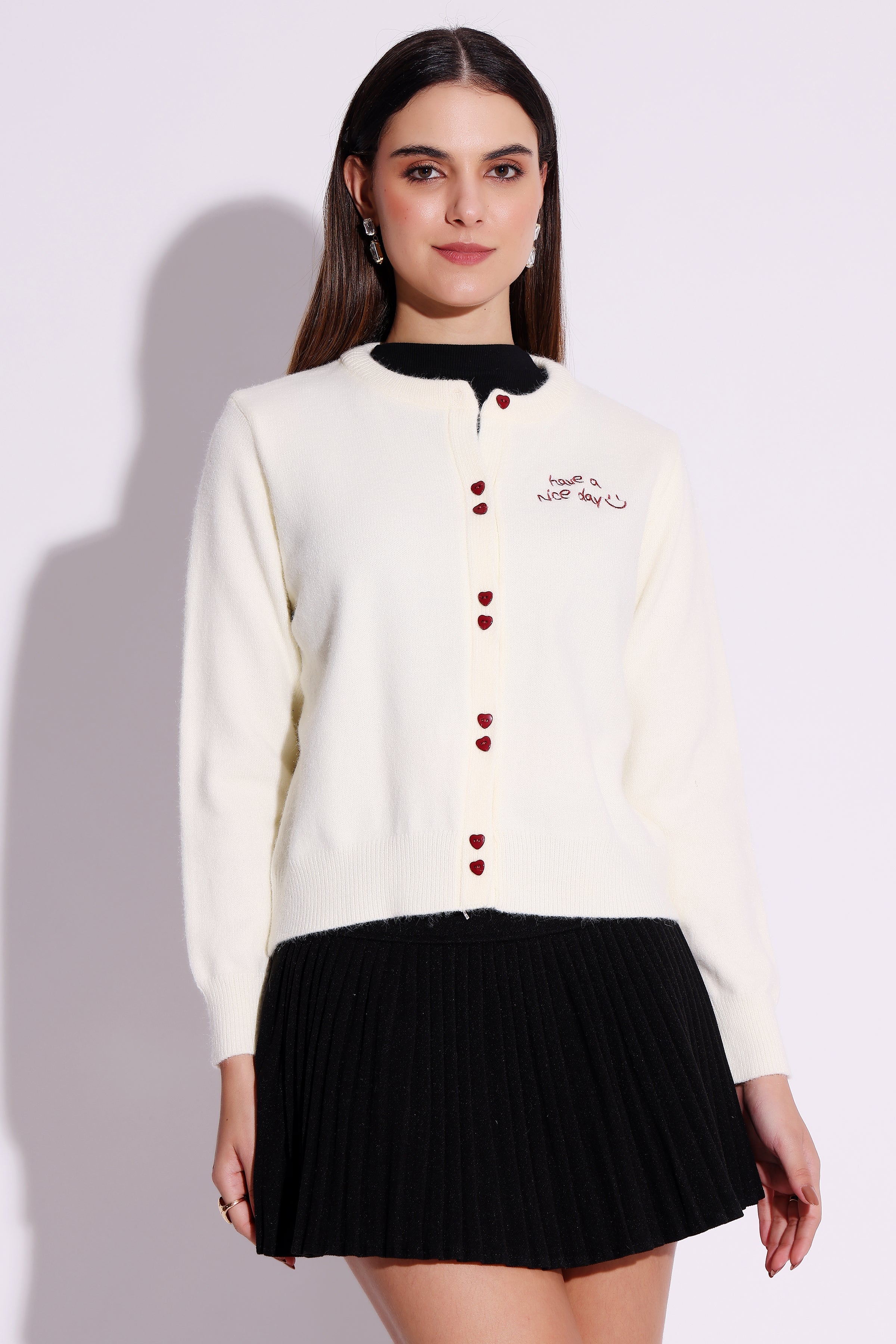 Rs. 2,499.00Rs. 2,499.00/The Ivory Cardigan with Heart Buttons is a charming and cozy knitwear piece. Crafted from a soft, high-quality ivory yarn, the cardigan features a classic button-up...