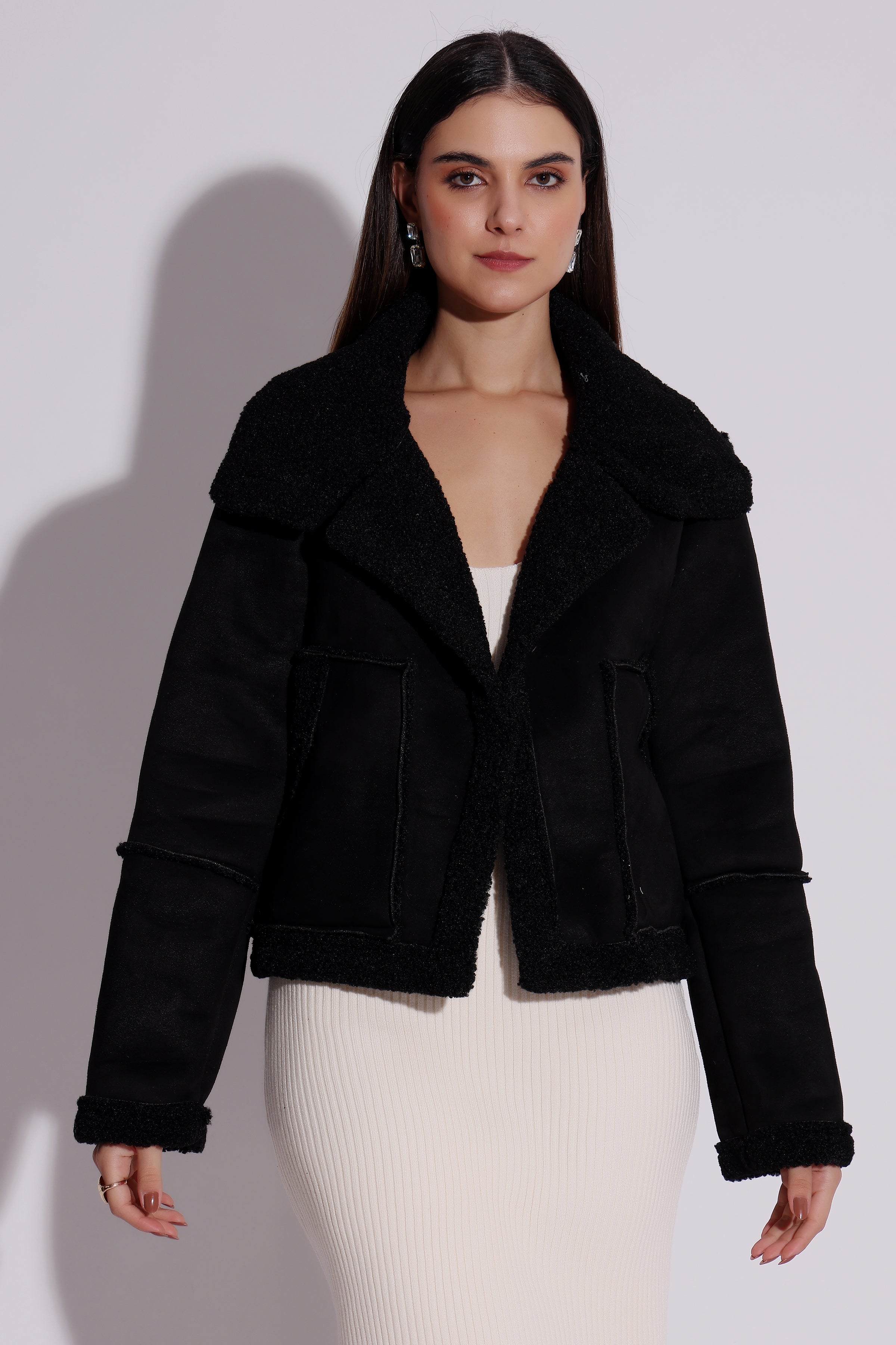 Rs. 3,599.00Rs. 3,599.00/Stay cozy and chic with this black faux shearling-lined jacket. Featuring a soft textured lining and a structured design, this jacket combines warmth and style effortlessly....