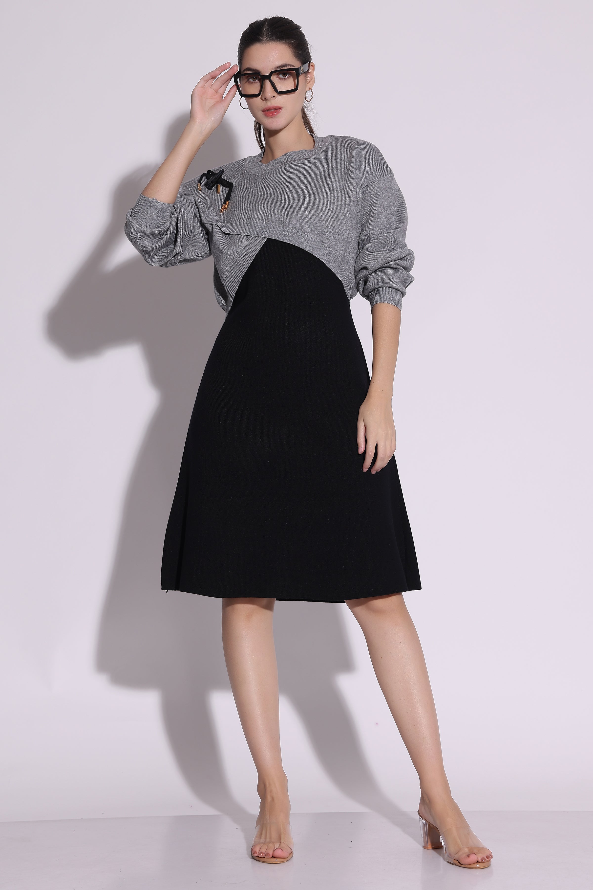 Rs. 3,499.00Rs. 3,499.00/Elevate your winter wardrobe with the Dual-Tone Knit Midi Dress. This chic design features a cozy gray knit top layered over a sleek black flared skirt,...