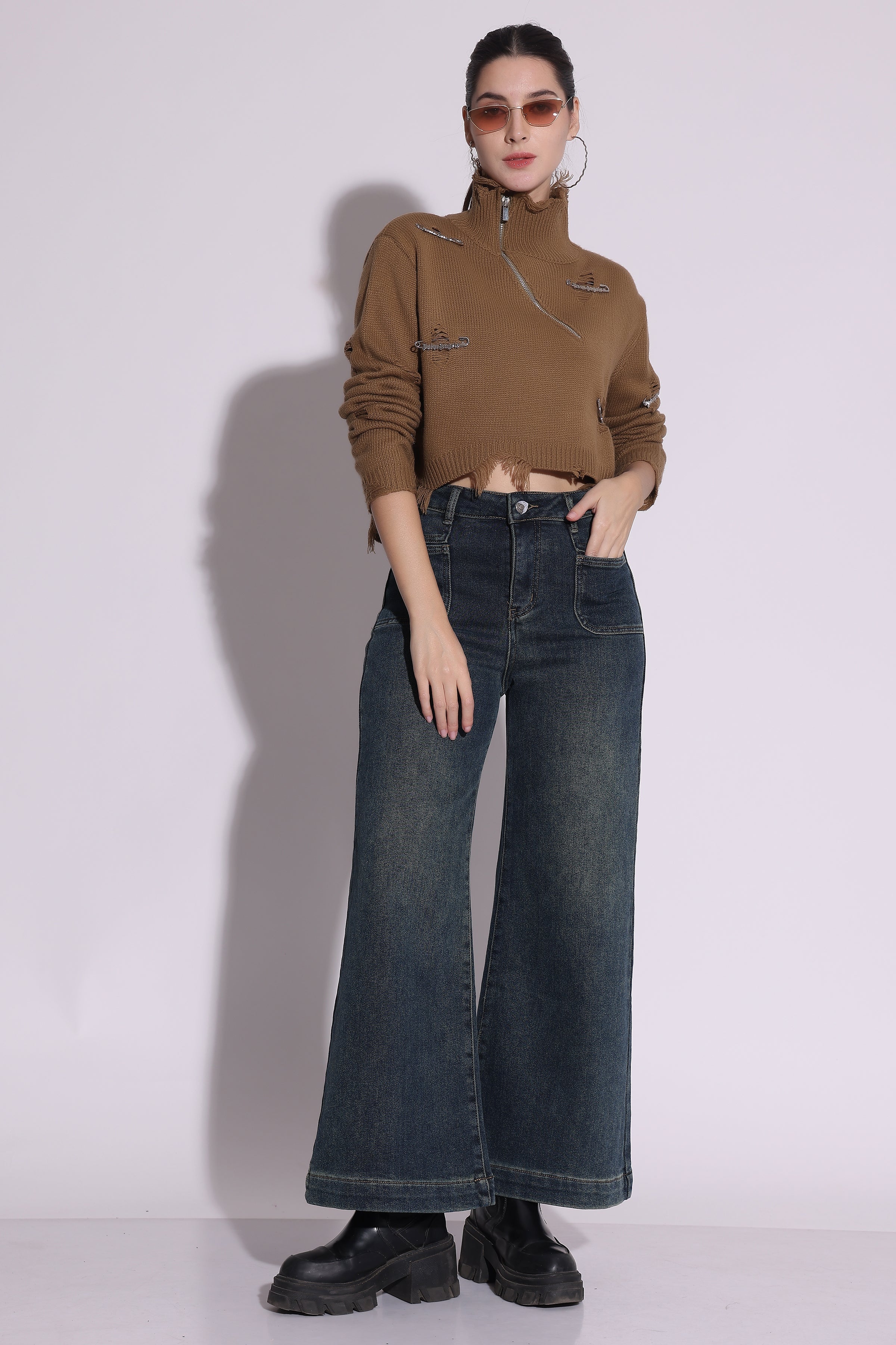 Rs. 2,399.00Rs. 2,399.00/Add an edgy touch to your winter wardrobe with this cropped distressed knit sweater in a warm caramel tone. Featuring unique zipper accents and raw hem...