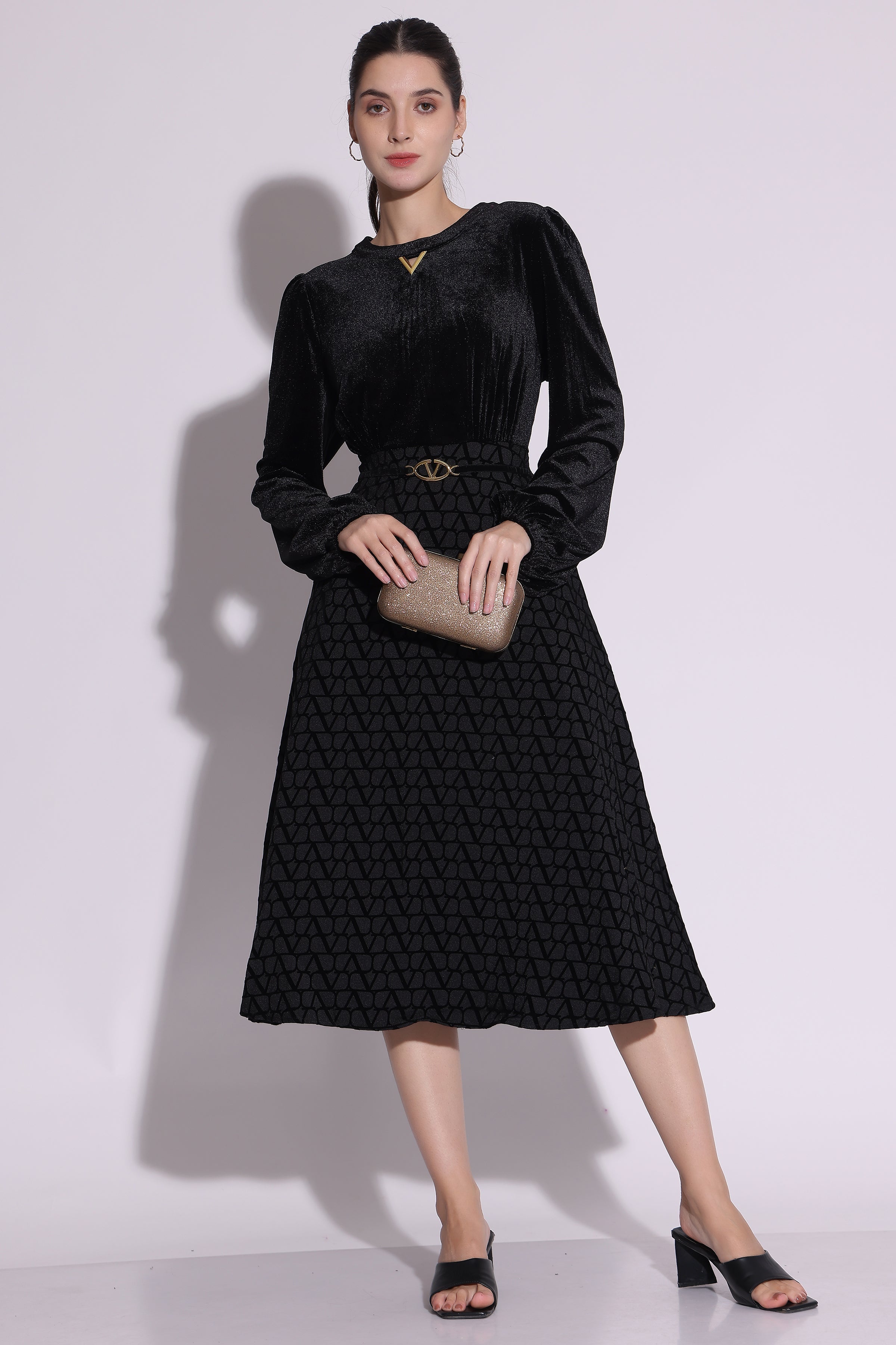 Rs. 5,299.00Rs. 5,299.00/Redefine winter sophistication with the Elegant Velvet Midi Dress. Featuring a luxe velvet top, long puff sleeves, and a patterned A-line skirt, this dress exudes timeless...