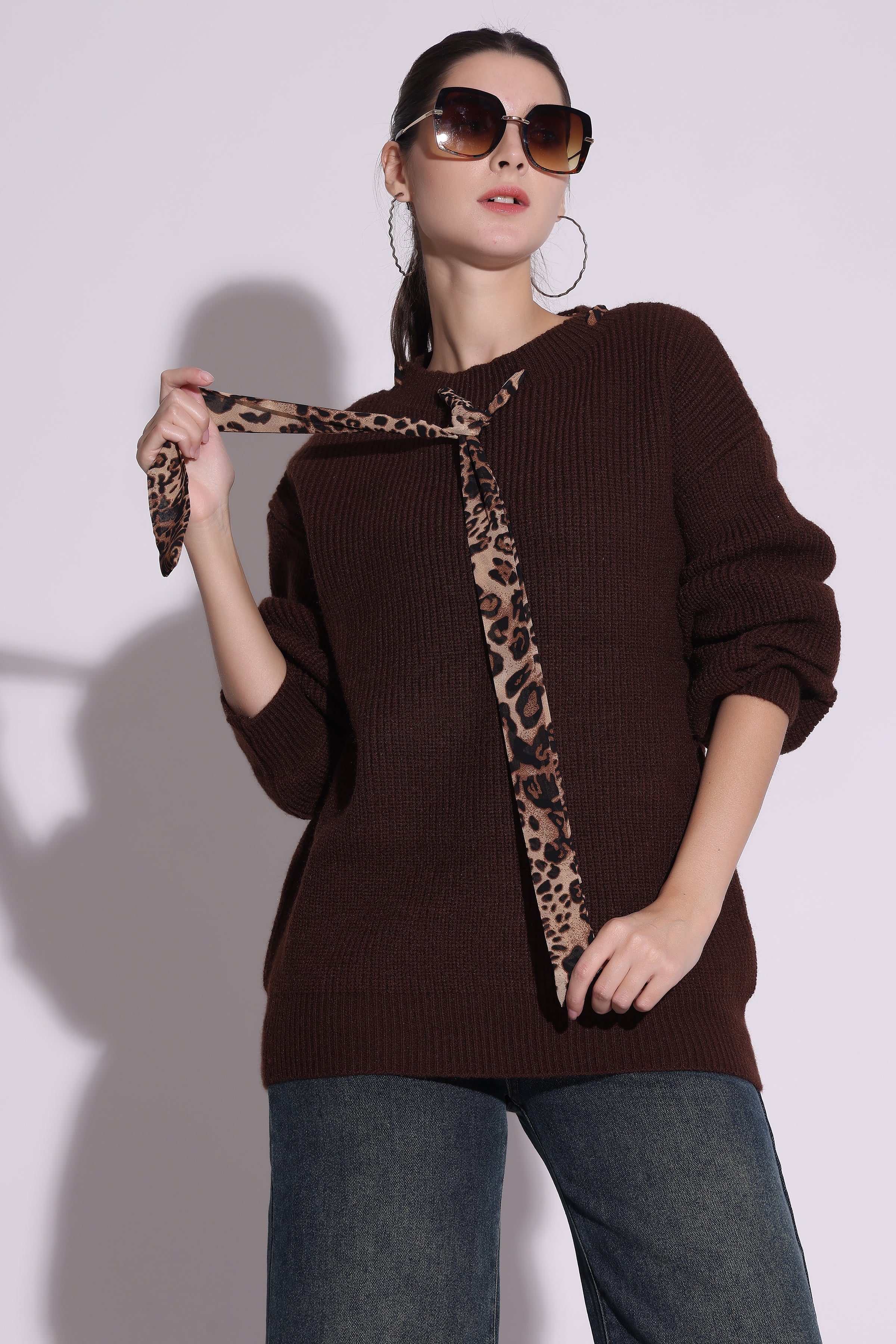 Rs. 2,999.00Rs. 2,999.00/Elevate your casual winter style with this chic oversized knit sweater in a rich brown hue. Featuring a bold leopard print tie detail, it adds a...