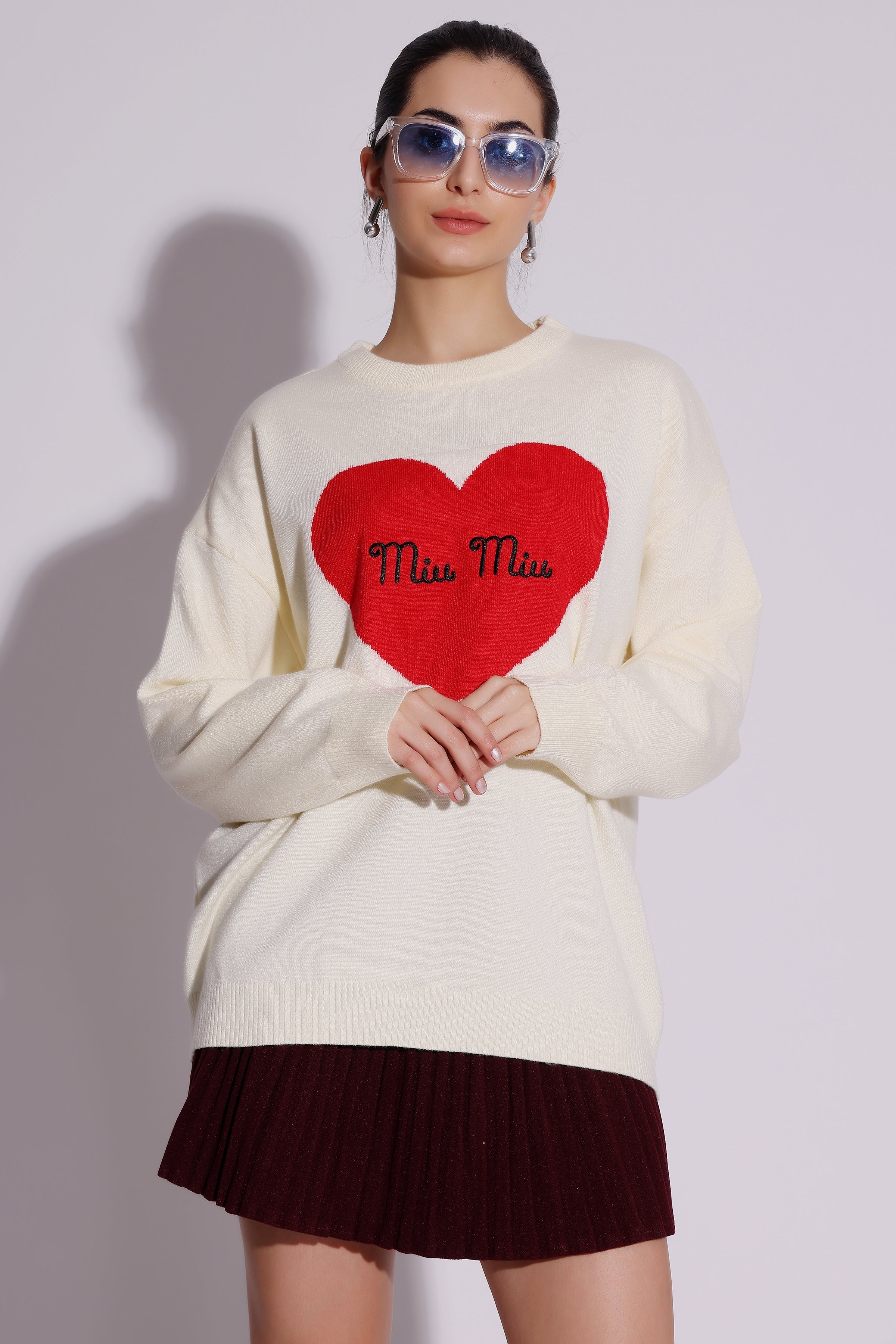 Rs. 1,999.00Rs. 1,999.00/Spread the love this winter with our Heart Embroidered Oversized Sweater. Featuring a bold red heart and "Miu Miu" text detail, this cozy sweater blends warmth...