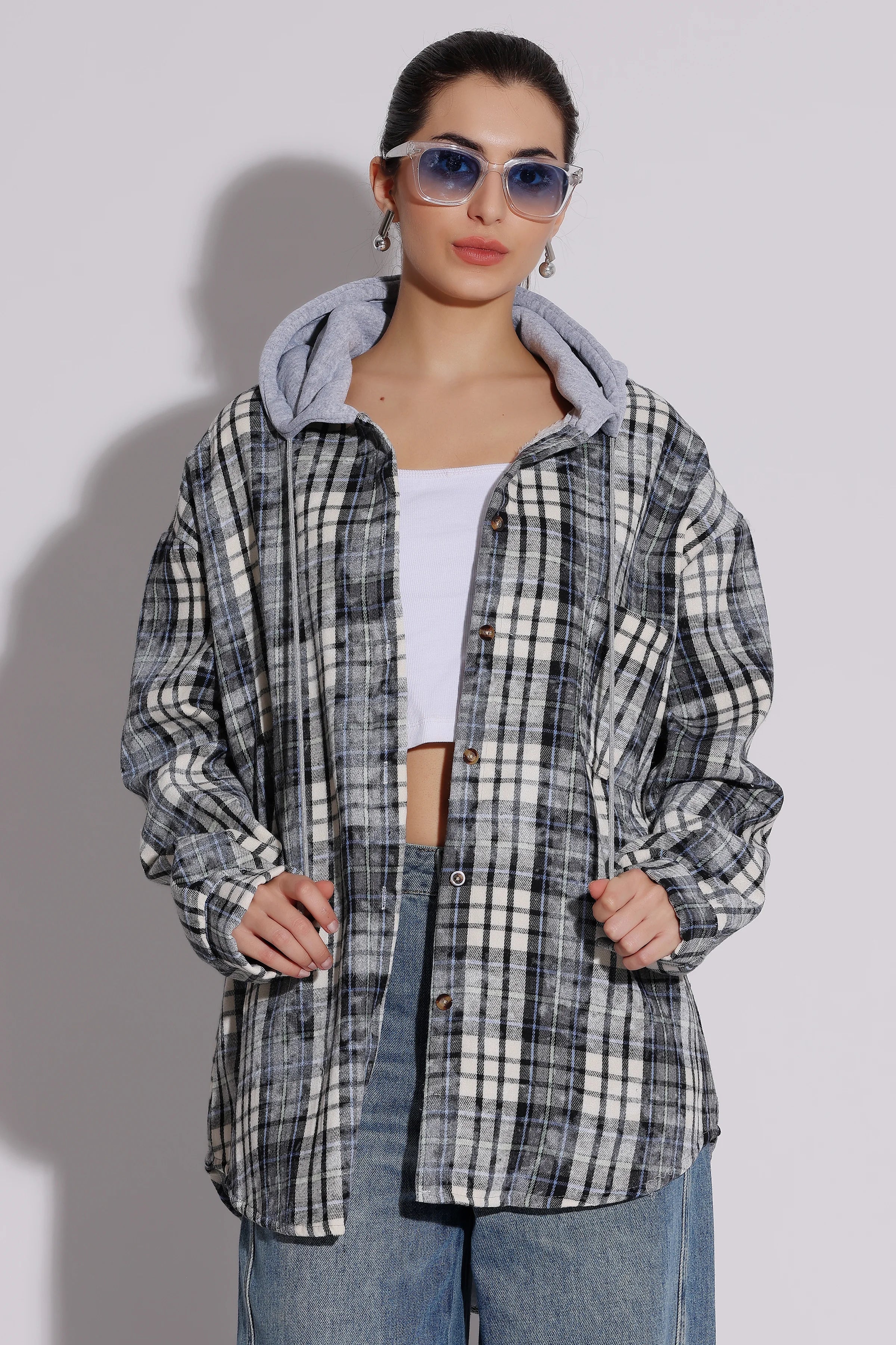 Rs. 2,499.00Rs. 2,499.00/A close-up view of a black-and-white plaid button-up shirt with an attached gray hoodie. The soft flannel fabric ensures comfort and style, while the drawstring detail...