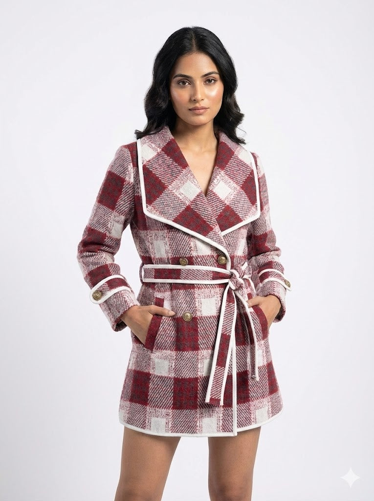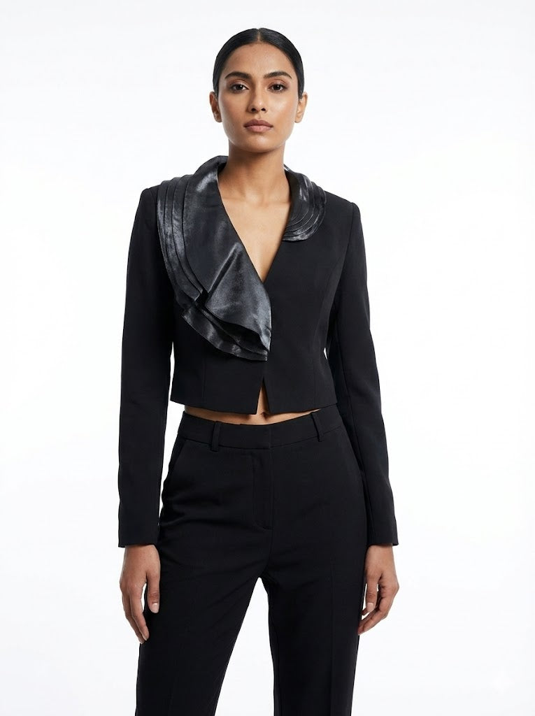 A statement piece that commands attention, this short jacket features an oversized collar that frames the face beautifully while adding architectural interest to any outfit. The...