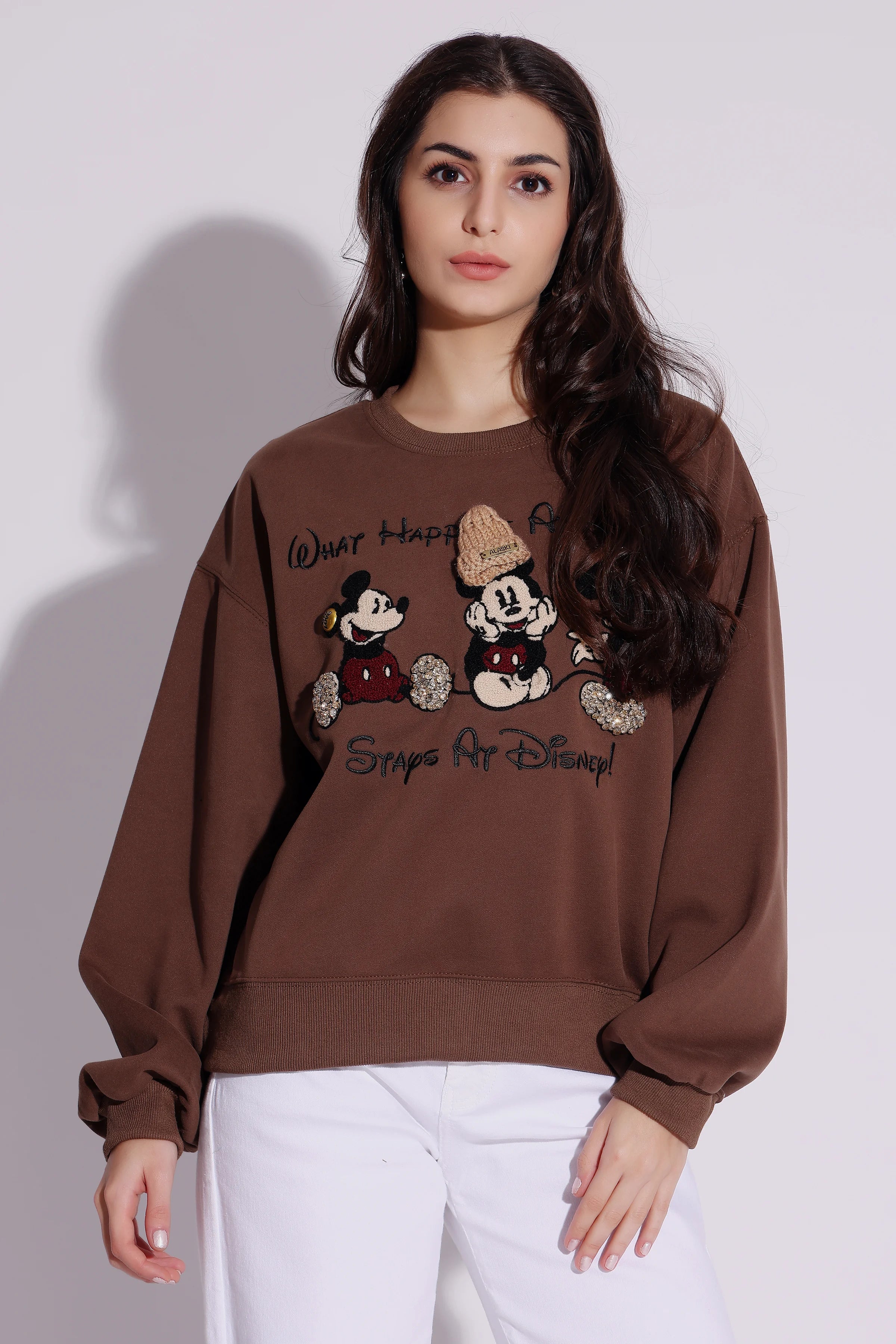 Rs. 2,999.00Rs. 2,999.00/This trendy brown sweatshirt features a playful Disney-inspired embroidered design, showcasing Mickey Mouse and friends in a mix of textures and details. The relaxed fit and...