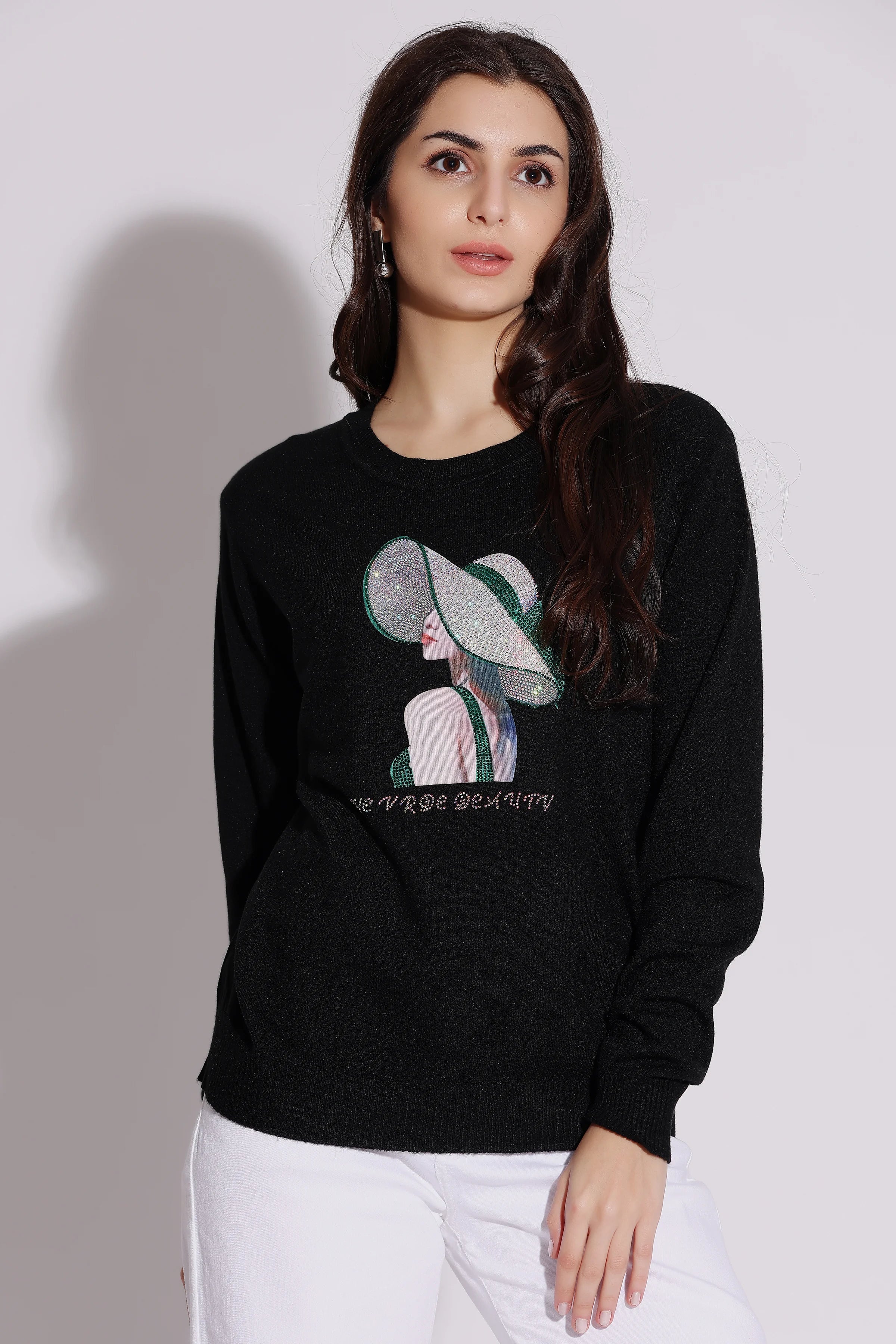 Black graphic sweater with elegant hat design