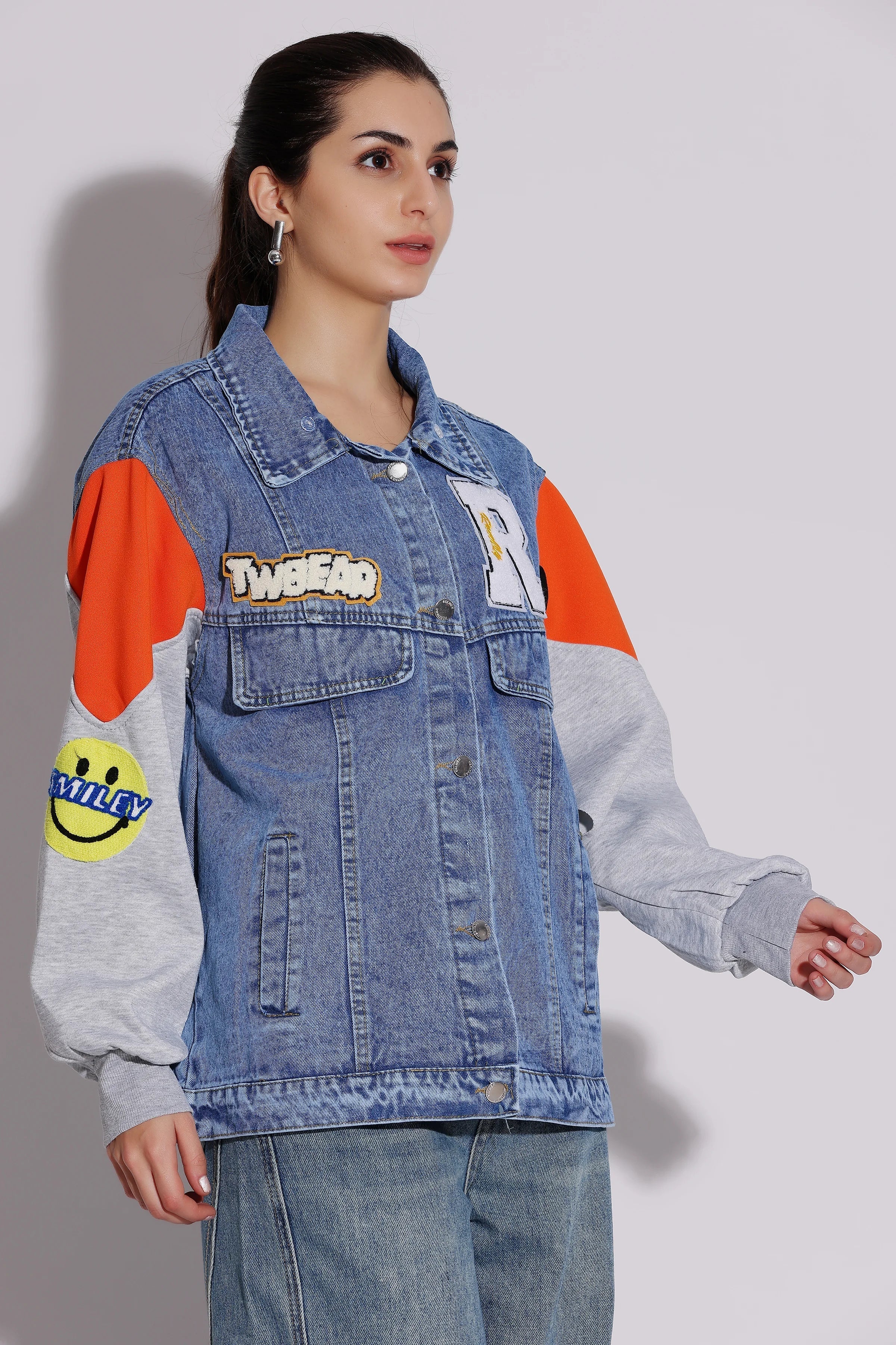 Trendy colorblock denim varsity jacket