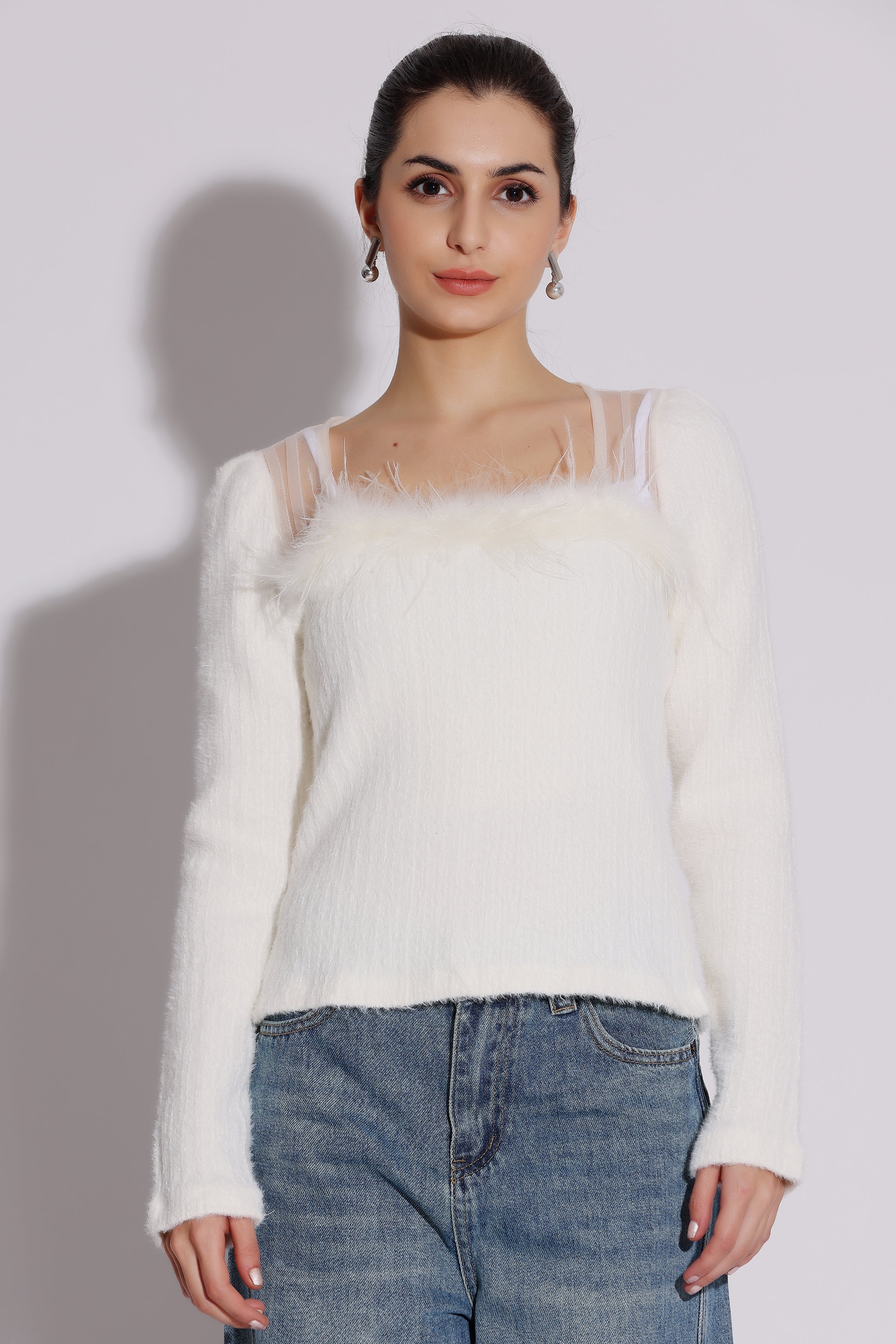 Rs. 2,299.00Rs. 2,299.00/This cozy and stylish sweater features a soft, fuzzy knit fabric in a beautiful ivory color. The square neckline and long sleeves create a chic, modern...