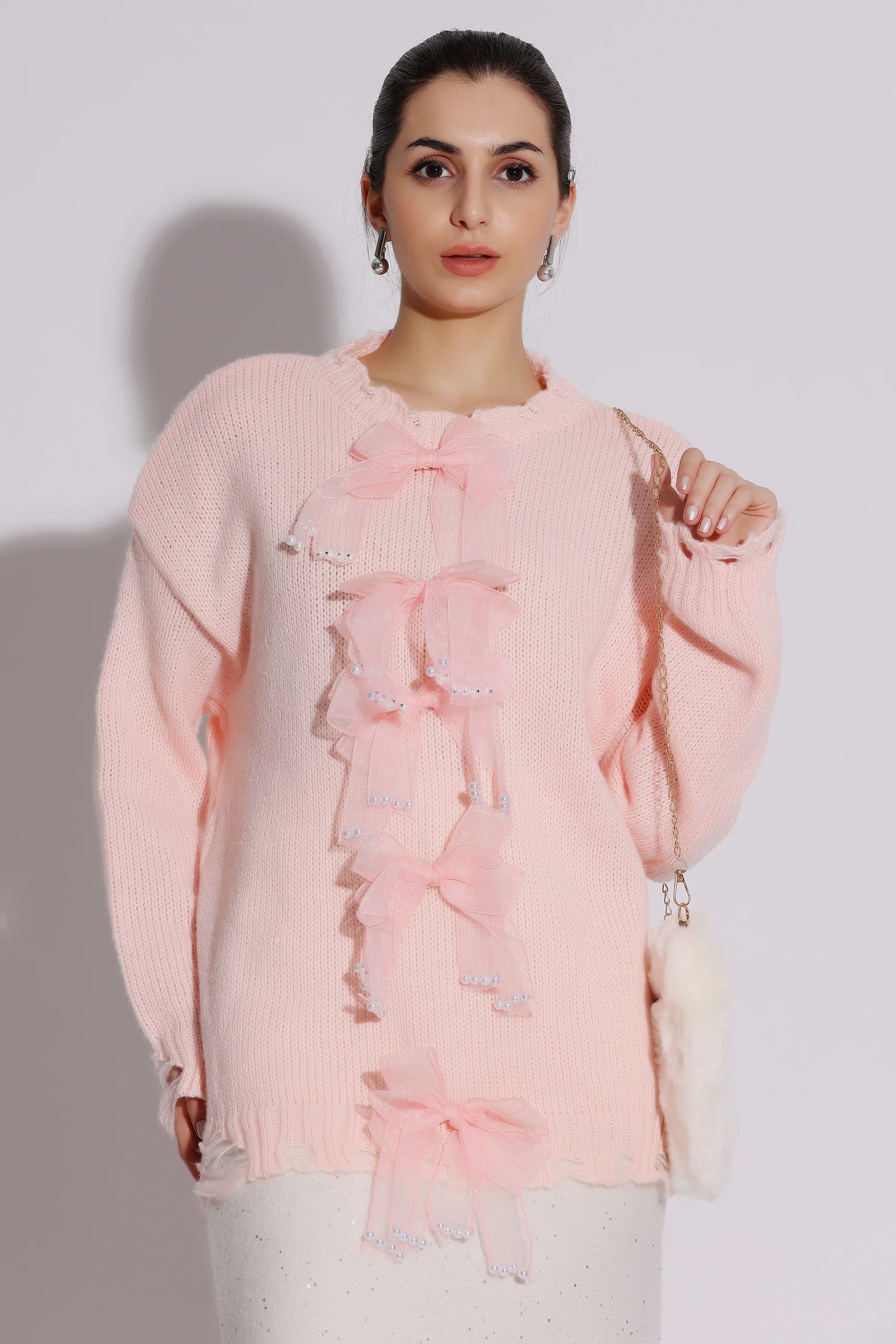 This charming sweater dress features a soft, pastel pink hue and delicate ruffled detailing throughout. The knit fabric provides a cozy, comfortable feel, while the ruffles add a touch of feminine elegance to the design. The dress has a relaxed, A-line silhouette that flatters the figure and can be dressed up or down for various occasions. The high neckline and long sleeves create a modest, yet stylish look. This versatile piece can be paired with heels and statement jewelry for a night out, or dressed down with sneakers and a denim jacket for a more casual daytime ensemble. The ruffled accents and soft color palette give this sweater dress a whimsical, romantic aesthetic.