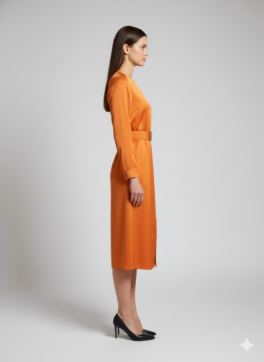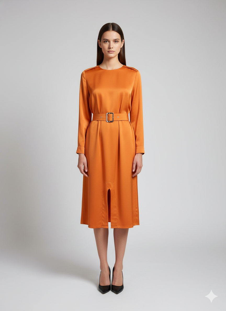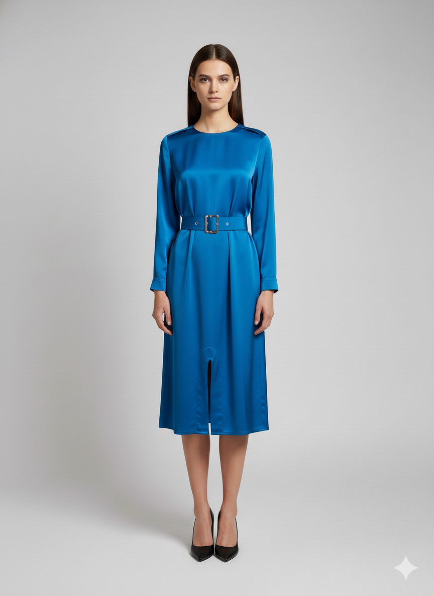 Elevate your wardrobe with this luxurious satin dress, a timeless piece that seamlessly transitions from day to evening occasions. Crafted from premium satin fabric, it drapes beautifully to create a flattering silhouette while maintaining an effortless elegance. The smooth, lustrous finish catches light gracefully, adding sophistication to any ensemble. Perfect for cocktail events, dinners, or special celebrations, this dress combines comfort with refined style. Its versatile design pairs well with heels, flats, or statement jewelry, making it an essential addition to any fashion-conscious wardrobe.